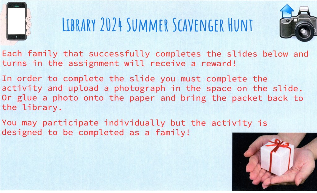 Join us in a little summer family fun! Download a copy of our summer scavenger hunt pages and have some fun completing the activities with your family. Stop by the library with your completed pages and we will reward you with a special prize!