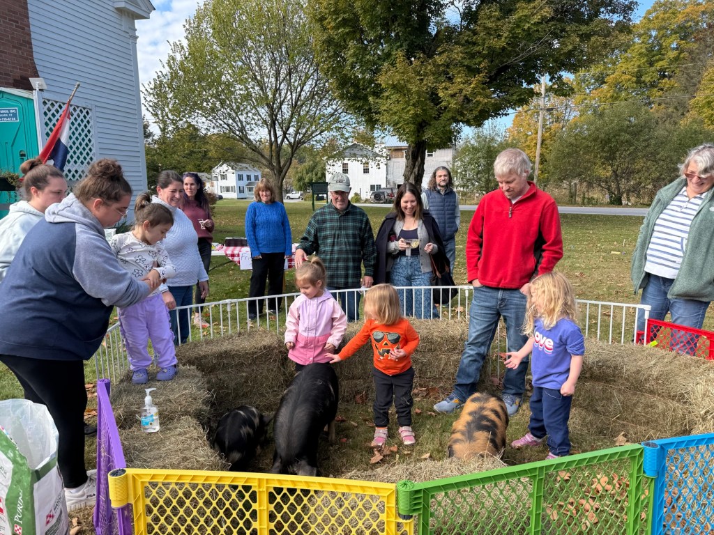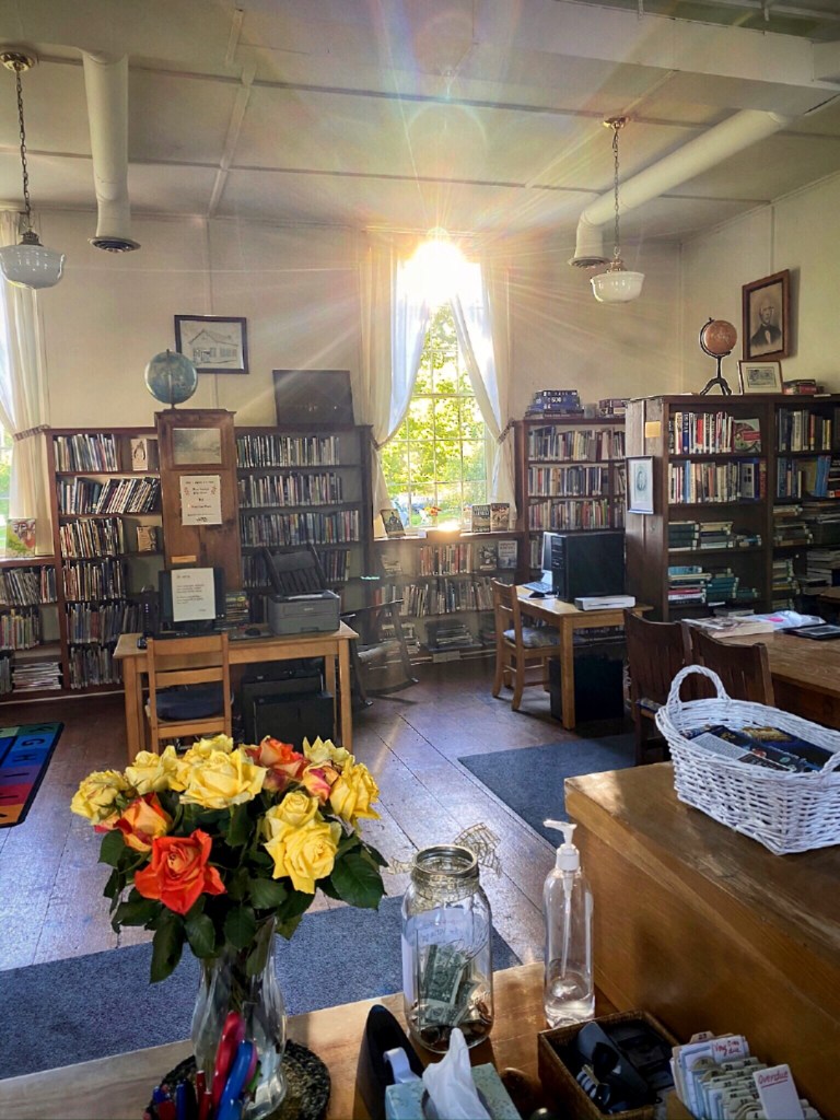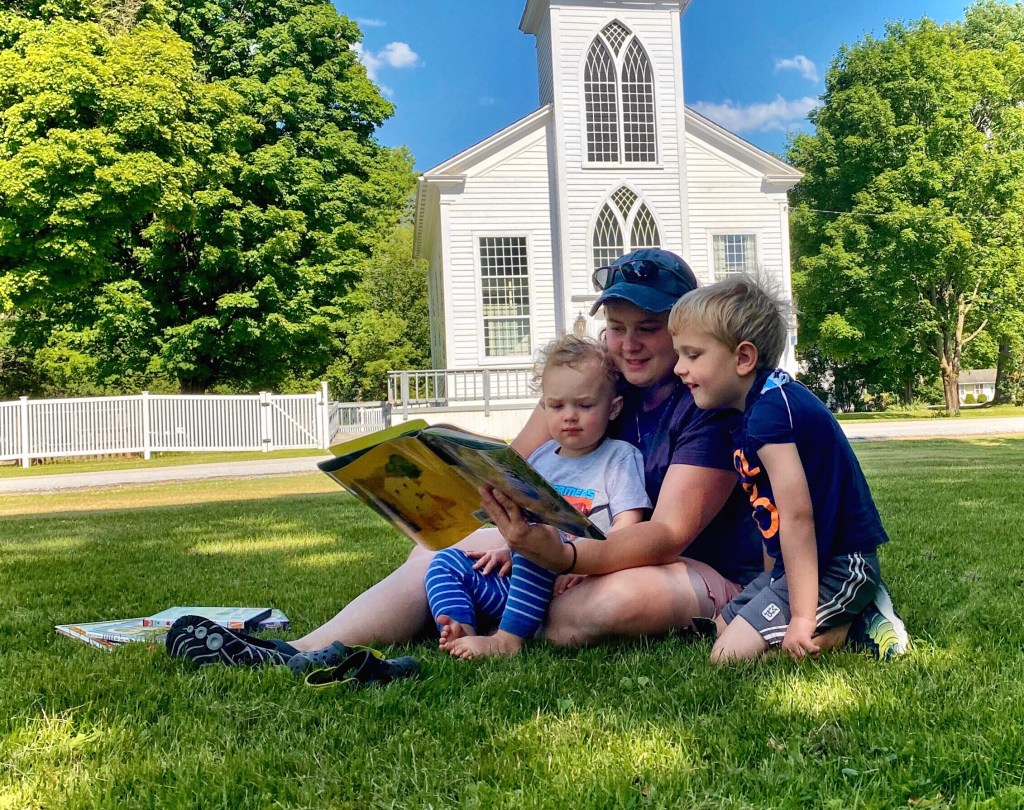 Library Board Co-chair, Amanda Butler, reads to her adorable tots on the green.Magic happens within these old walls.